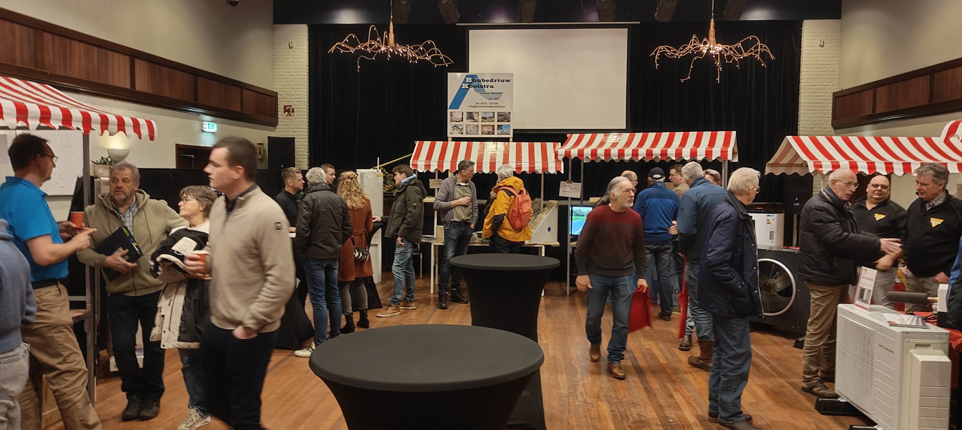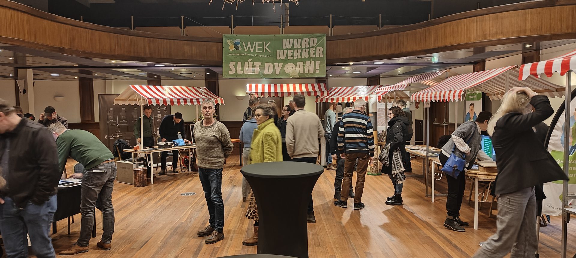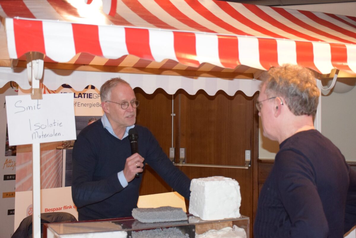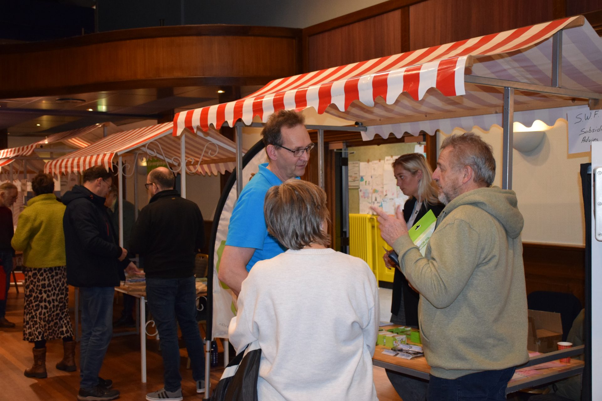 Standhouders waren: de Smit Isolatiegroep met diverse isolatiematerialen, De Wolk Glas met verschillende soorten isolerend glas, de Friese Milieufederatie met info over biobased isolatiemateriaal, Bouwbedrijf Kooistra Kûbaard/Wommels met duurzaam bouwen, Installatiebedrijf Lukkes met warmtepompen, zonnepanelen en thuisbatterijen, Koning Installatie met thuisbatterijen en zonnepanelen, Atsun over slimme energieoplossingen, Confin van Pier Zwerver uit Wommels over energieadvies en energielabels, Henk Zegwaard van Betaalbaar Gasloos over voordelig vervangen van CV door warmtepomp, Zwembad De Klomp over heatpipes waar ze tegenwoordig het zwembadwater mee verwarmen, de Gemeente SWF met energiecoaching en info over subsidies en de WEK met energiecoaching, warmtebeeldcamera en energieadvies.