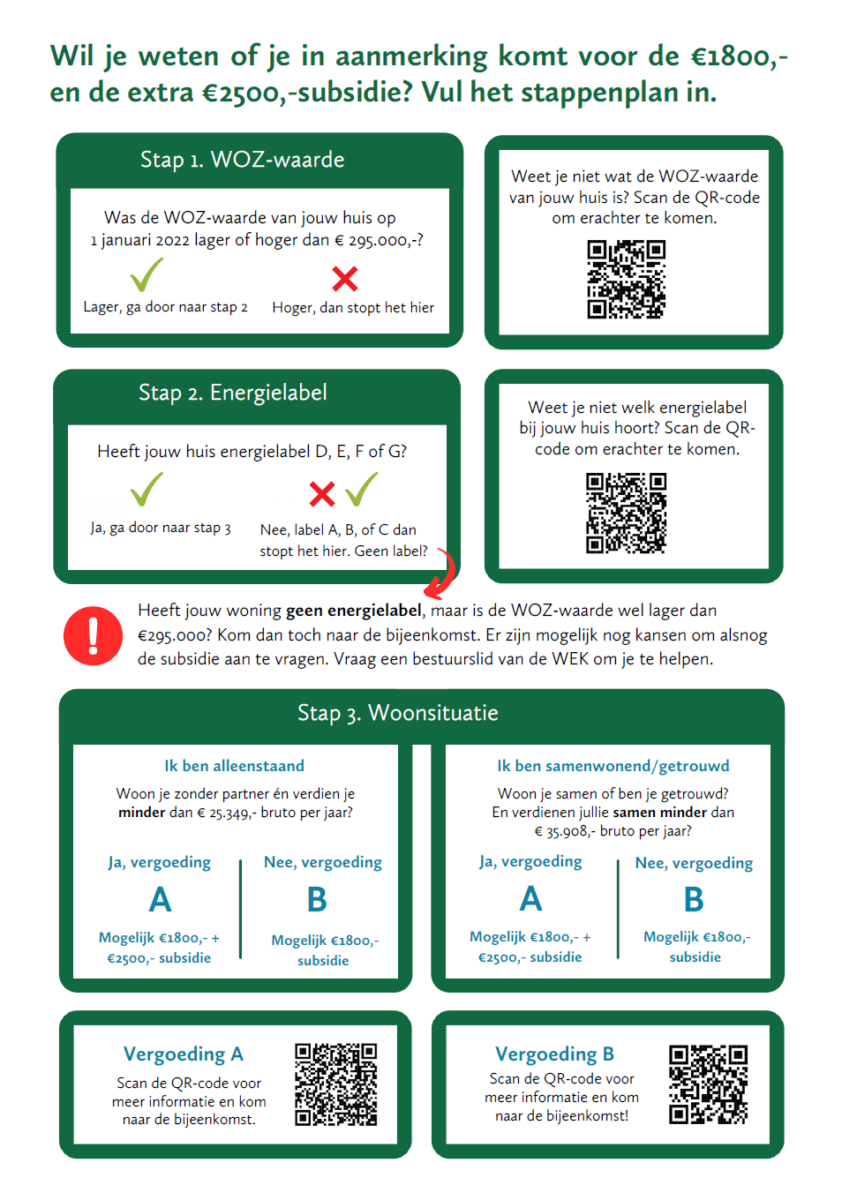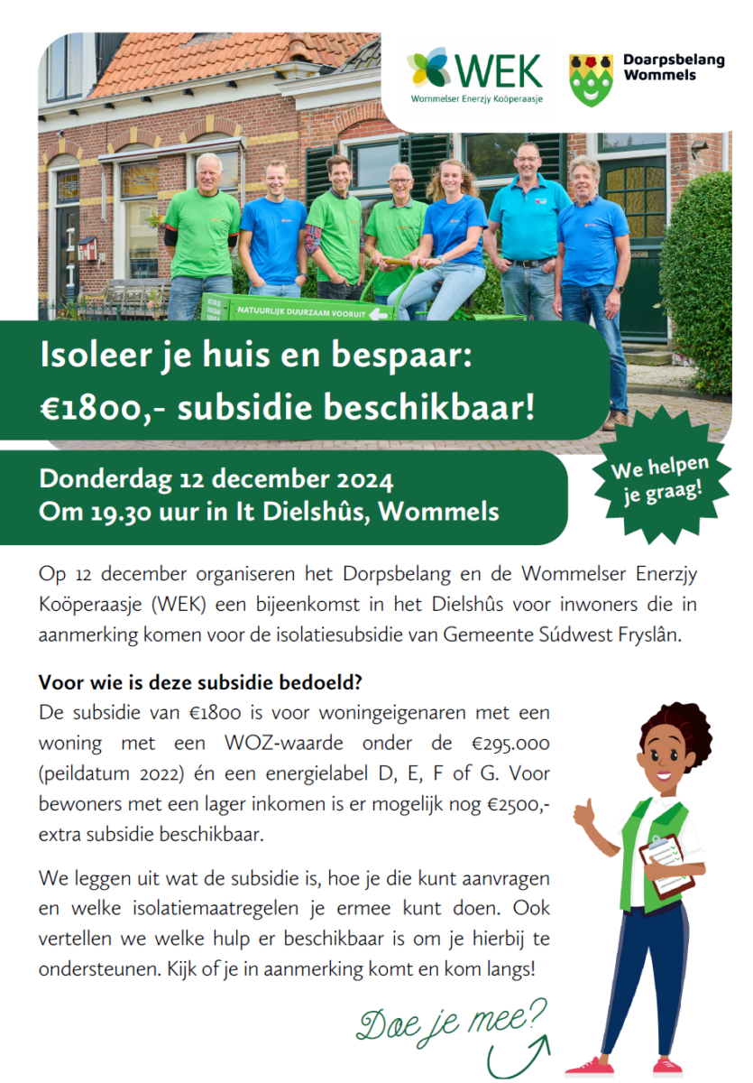 De Wommelser Enerzjy Koöperaasje (WEK) en Dorpsbelang Wommels organiseren op 12 december om 19.30 uur een bijeenkomst in het Dielshûs voor inwoners die in aanmerking komen voor de NIP-isolatiesubsidie van Gemeente Súdwest Fryslân. De NIP is het Nationaal Isolatie Programma waarin per woning die ervoor in aanmerking komt (WOZ < € 295.000 en Energielabel D, E, F of G) € 1800,- beschikbaar is. De betrokken huishoudens krijgen een toelichtende brief van de gemeente Súdwest Fryslân. Daarnaast zullen dorpsgenoten de huishoudens, die in aanmerking komen voor deze subsidie, individueel onderstaande flyer aanbieden. Wij (WEK en Doarpsbelang) hopen dat de bewoners komen 12 december; het geld is nu beschikbaar bij de gemeente! En natuurlijk is isoleren, hoe simpel maar ook, op langere termijn verstandig en geld besparend. Naast de NIP is ook nog ISDE-subsidie aan te vragen.