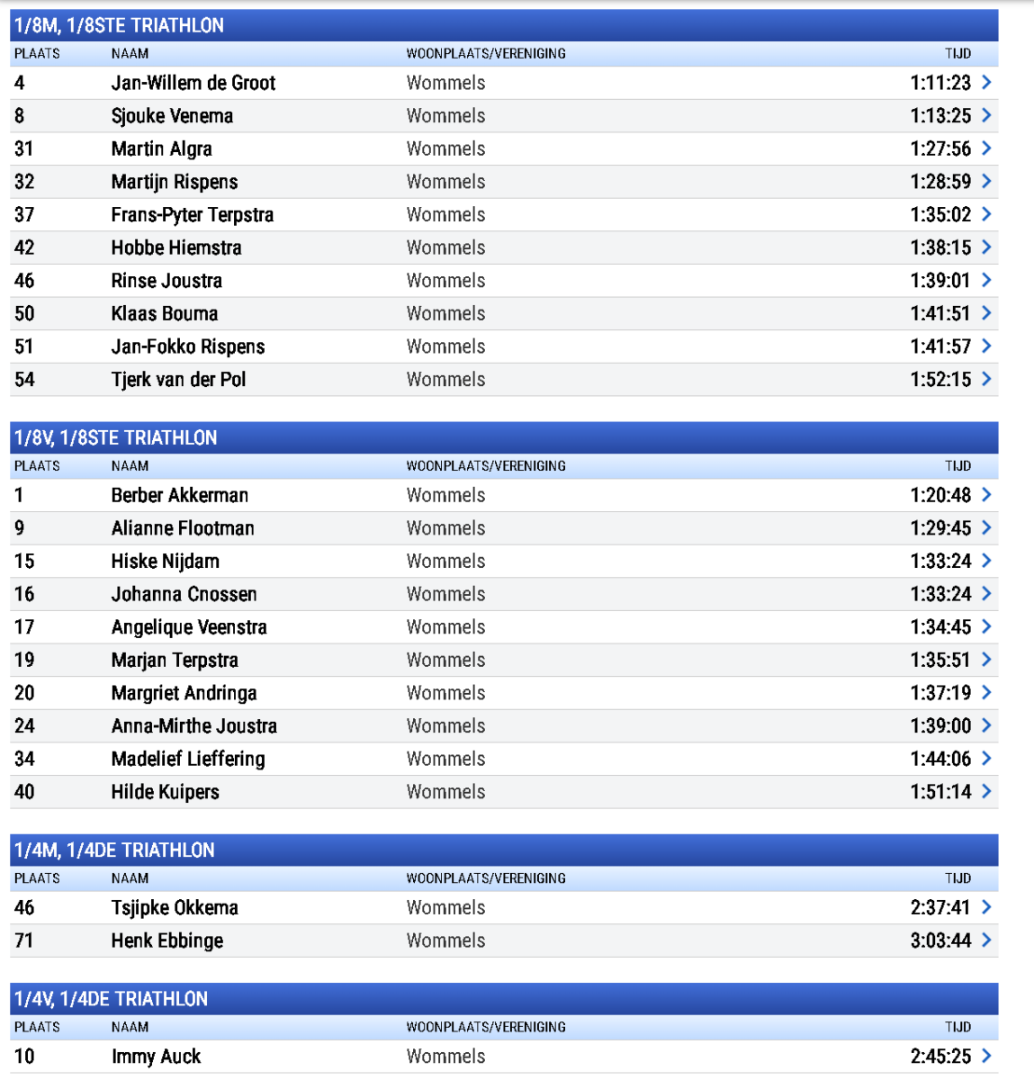 Afgelopen zaterdag was de Triathlon Wommels. Het was de dertiende editie van dit sportieve evenement met deze keer een record aantal deelnemers van 250. Zij deden een eenachtste of een kwart triathlon. Het startschot werd gegeven door wethouder van SWF Bauke Dam. De start was in De Appelhof, finish in zwembad De Klomp. Er werd gezwommen in de Bolswarder trekvaart, gefietst rond Wommels en hard gelopen door de Súdhoeke; de wisselzone was op het terrein van Hankel. Veel vrijwilligers en sponsoren maakten dit evenement mede mogelijk. De Triathlon Wommels was tevens de afsluitende race van de Fryslân Cup, een competitie van verschillende duo- en triathlons gedurende het hele jaar in Friesland.