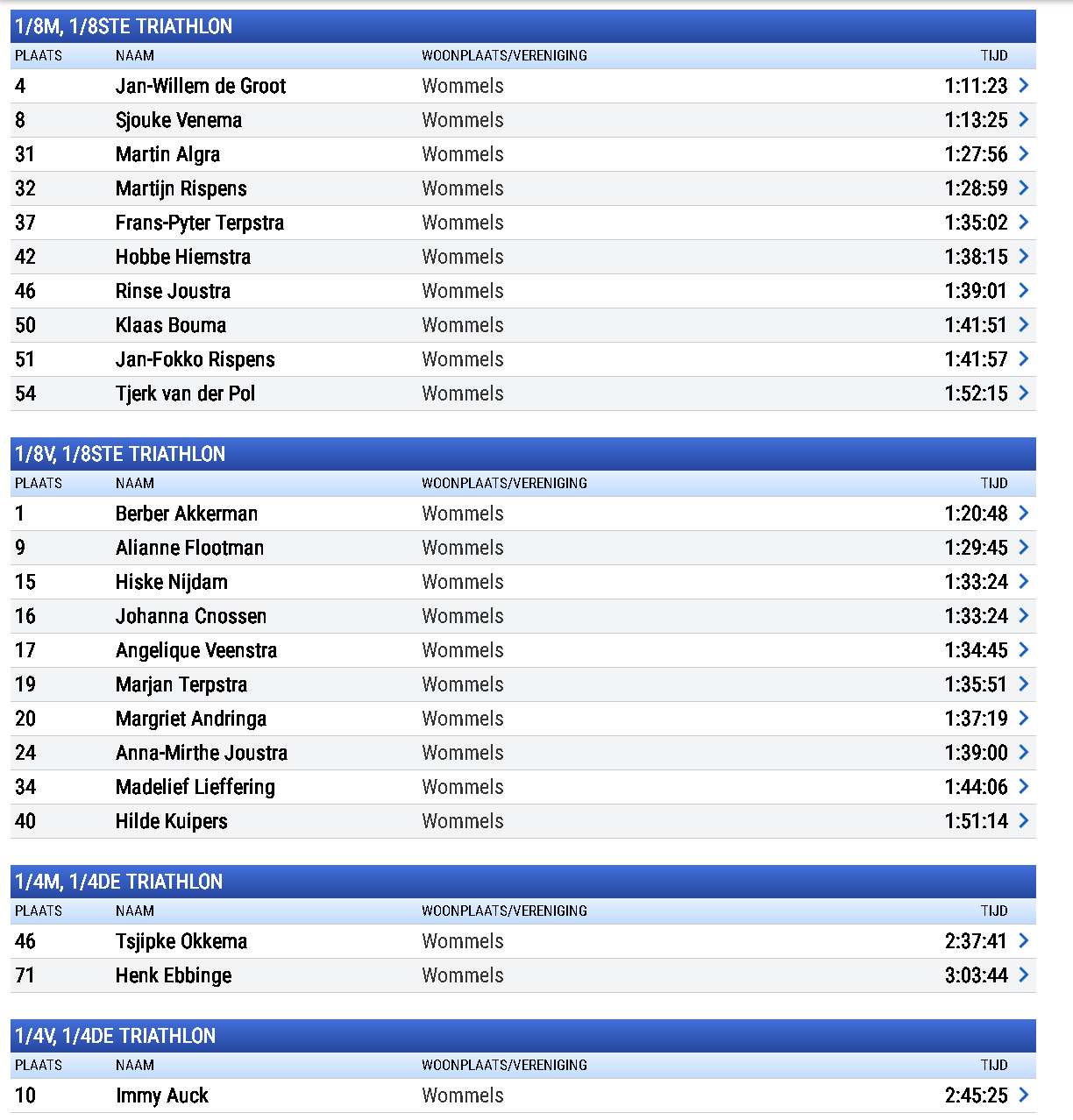 Afgelopen zaterdag was de Triathlon Wommels. Het was de dertiende editie van dit sportieve evenement met deze keer een record aantal deelnemers van 250. Zij deden een eenachtste of een kwart triathlon. Het startschot werd gegeven door wethouder van SWF Bauke Dam. De start was in De Appelhof, finish in zwembad De Klomp. Er werd gezwommen in de Bolswarder trekvaart, gefietst rond Wommels en hard gelopen door de Súdhoeke; de wisselzone was op het terrein van Hankel. Veel vrijwilligers en sponsoren maakten dit evenement mede mogelijk. De Triathlon Wommels was tevens de afsluitende race van de Fryslân Cup, een competitie van verschillende duo- en triathlons gedurende het hele jaar in Friesland.